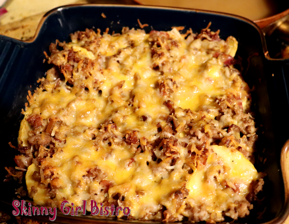 3.     Layer the base: Spread cubed bread in the baking dish. Top with sautéed veggies, cooked sausage or turkey, and bacon bits.