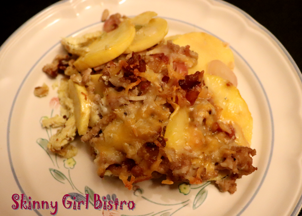 But a friend gifted us several beautiful yellow squashes. They were pretty large and very flavorful, so one-half of one big one was enough for this really delicious casserole. Made with a low carb bread–I used Timberwolf, but any 1 Net carb per slice bread will work–it is more like a strata than a crust base. See this post for other bread options: